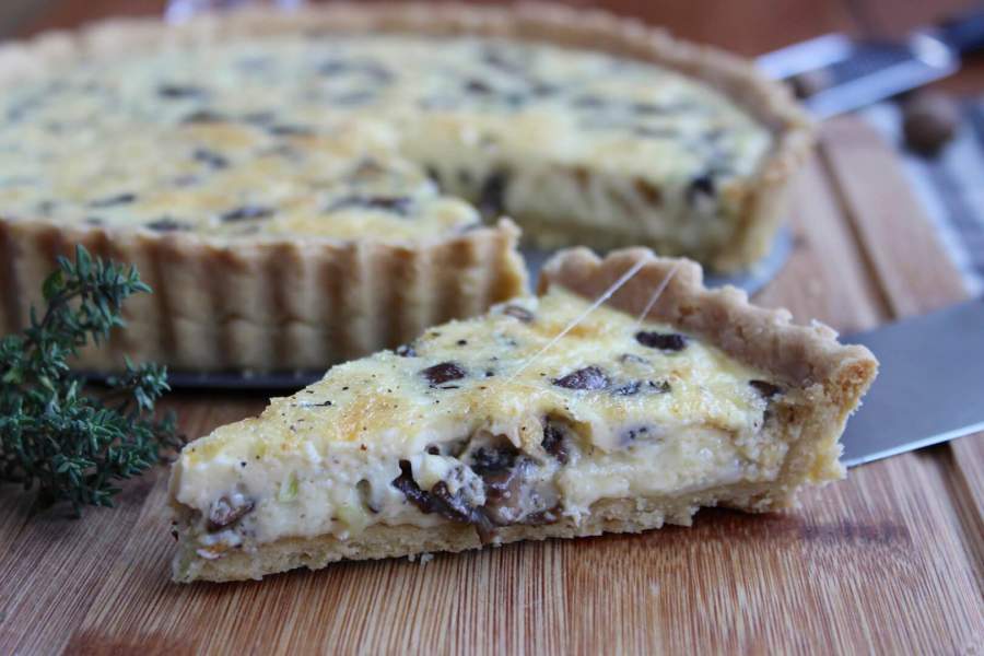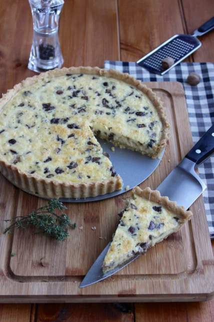 Киш с шампиньонами и сыром предлагаем испечь в духовке, используя основу из теста, замешенного по способу пате бризе (рубленое песочное тесто) на сливочном масле с добавлением яйца и молока.