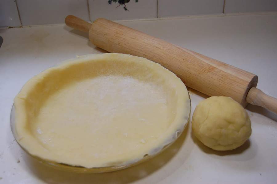 5. Наверните раскатанное тесто на скалку, перенесите в смазанную форму, уложите на дно с переходом на бортики и прижмите к стенкам. Проведите скалкой по краям, обрезая ненужные кусочки теста.