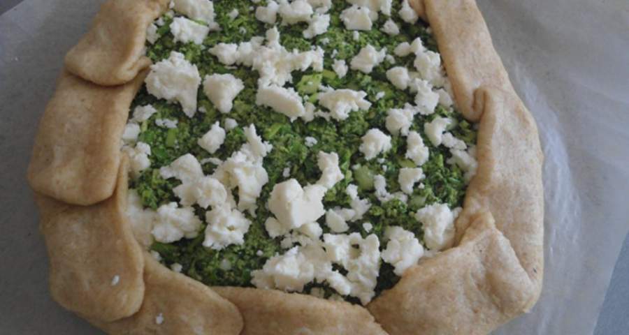 9. Зеленую часть начинки посыпьте раскрошенным адыгейским сыром. Приподнимите края теста на начинку м произвольно соберите в сборки, оставляя середину пирога свободной.